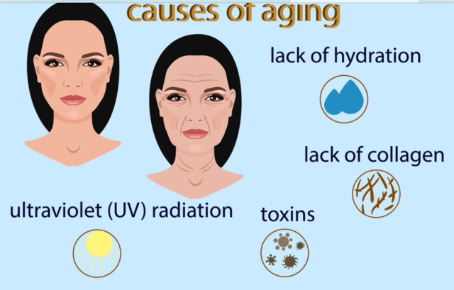 Ada banyak alasan mengapa orang menderita penuaan kulit dini (lebih cepat). Di duga karena adanya pengaruh dari pola makan yang buruk, kurang tidur dan istirahat serta stres sehari-hari. Dua faktor terbesar yang tidak dapat dikendalikan dan berkontribusi terhadap penuaan kulit dini adalah sinar matahari dan polusi.
