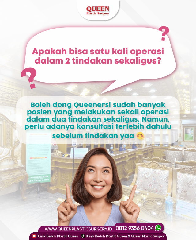 Salah satu keunggulan Queen Plastic Surgery adalah perhatiannya terhadap pasien pasca-operasi. Tidak hanya fokus pada hasil operasi, Kami juga memastikan bahwa pasien mendapatkan perawatan terbaik selama masa pemulihan. Sebab itu pasien akan mendapatkan instruksi jelas mengenai perawatan diri di rumah, dan klinik, Serta mendapatkan GRATIS kontral pasca operasi.