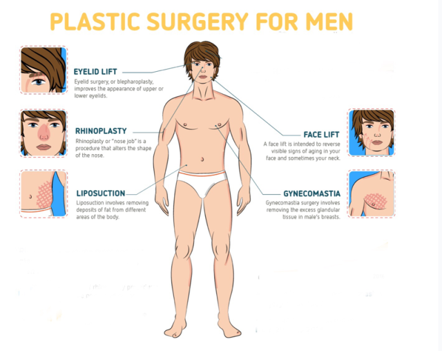Meskipun sebagian besar prosedur operasi plastik dilakukan pada wanita, terdapat peningkatan jumlah pria yang menunjukkan minat untuk menjalani operasi plastik. Alasan utamanya adalah masyarakat cenderung semakin fokus pada penampilan fisik. Pria ingin tampil menarik untuk membangun kepercayaan diri yang mengarah pada hubungan dan pertumbuhan karir yang lebih baik. Inilah alasan mengapa ada banyak jenis operasi plastik untuk pria. Di bawah ini adalah prosedur operasi plastik umum yang tersedia dan/atau khusus untuk pria.