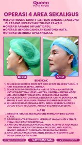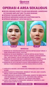 Klinik Kecantikan Queen Plastic Surgery merupakan klinik terpercaya dengan berbagai macam pelayanan mulai dari perawatan-perawatan sederhana hingga operasi bedah plastik. Banyak pasien yang datang untuk berkonsultasi hingga memutuskan untuk melakukan perawatan atau operasi di Klinik Kecantikan Queen Plastic Surgery. Banyak perawatan yang ditawarkan guna menjadikan Queeners cantik, menawan dan menarik. Mulai dari Operasi Facelift hingga operasi rhinoplasty dan kantung mata yang menjadi keunggulan di Klinik Kecantikan Queen Plastic Surgery.