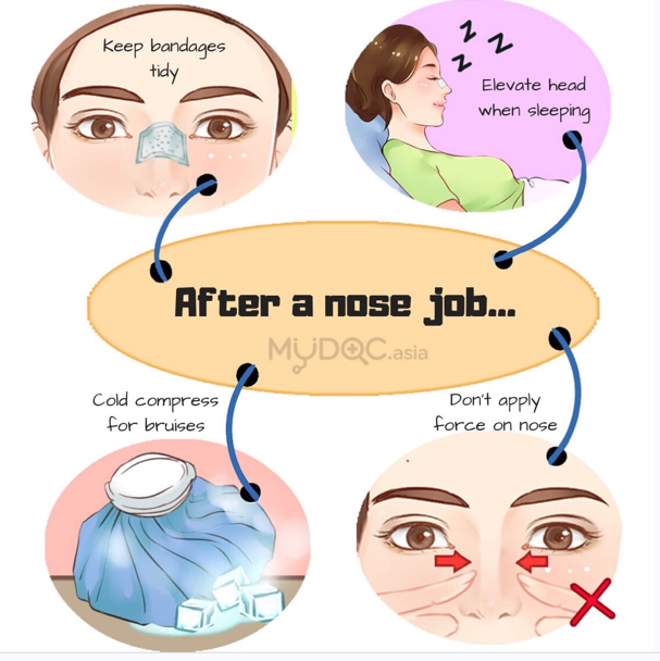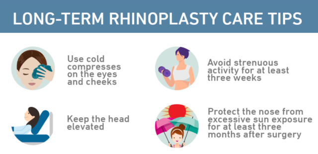 Selama 72 jam pertama pasca operasi, bisa menggunakan kompres dingin untuk menjaga kenyamanan. Namun, harus berhati-hati untuk tidak meletakkan kantung es langsung di hidung. Sebaliknya, tempelkan pada salah satu pipi untuk memastikan tidak menggeser tulang rawan atau tulang apa pun secara tidak sengaja.